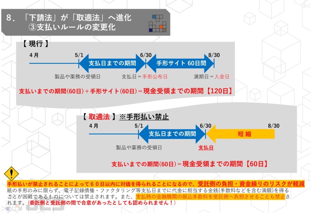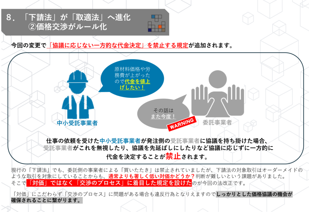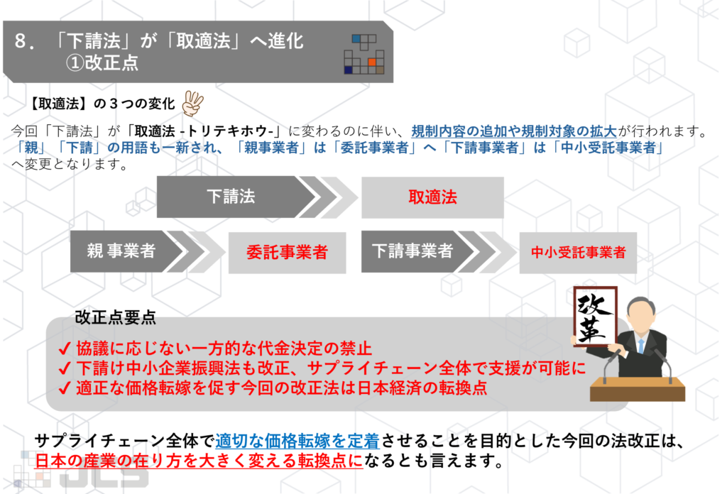 委託事業者による下請事業者への不当な取り扱いを規制する「下請代金支払遅延等防止法(下請法)」の改正法が来年1月1日に施行されます。法律名も「中小受託取引適正化法(取適法=とりてきほう)」に変わります。実は、日本の商取引の根幹を変えるほどのインパクトがあるという今回の法改正、皆さんの会社では対応準備されていますか?