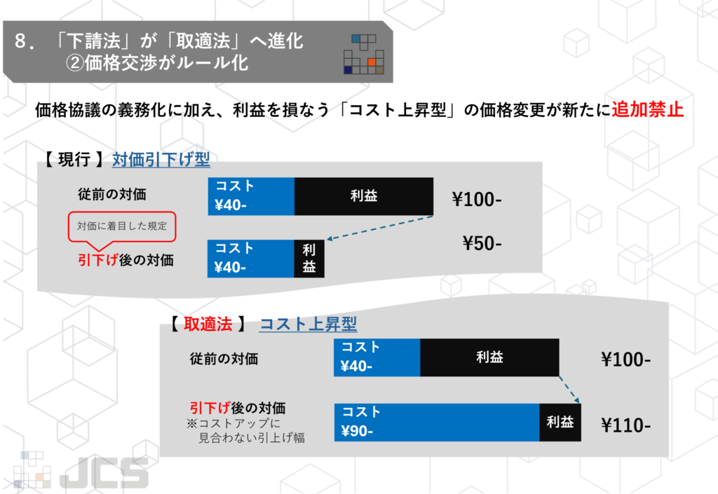 これまで日本の産業界にある「とにかく価格を安く」という風潮は、物価が上昇していくなかで限界がきています。適正な価格転嫁はサプライチェーン全体を強くし、産業を強固なものとし、経済全体の好循環につながっていく――。今回の法改正は、こうした意識変化を促し、日本の経済全体にとって大きな転換点になると思われます。