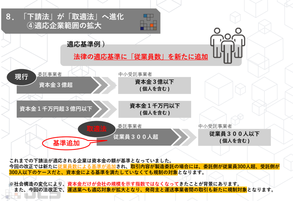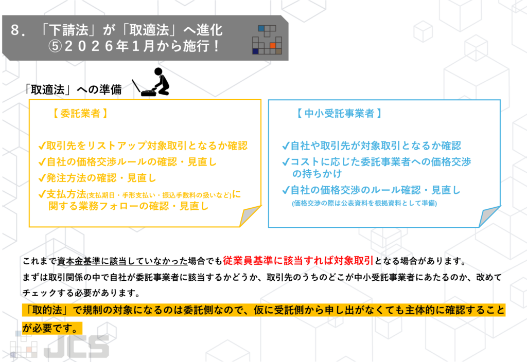 今回の「下請法」が「取適法」への対応策サポートはJCSへお任せください。経験豊富なスタッフが全力でサポートさせて頂きます。